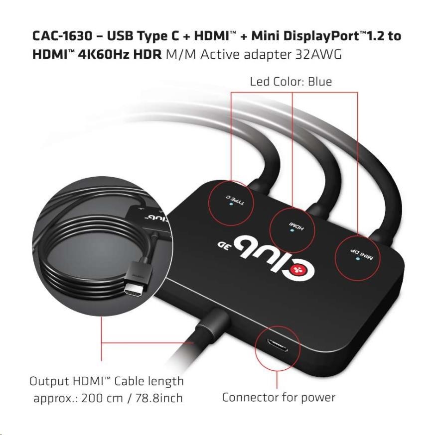 | Product Name | CAC-1630 USB Type C* + HDMI™ + Mini DisplayPort™1.2 to HDMI™ 4K60Hz HDR M/M Active adapter 32AWG |
