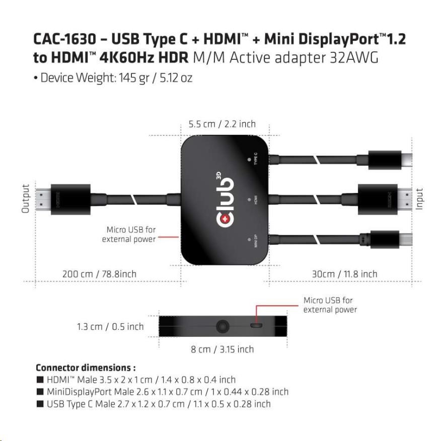 Club3D adaptér aktivní USB Type-C + Mini DP 1.2 + HDMI na HDMI 4K60Hz HDR, M/M, 32AWG