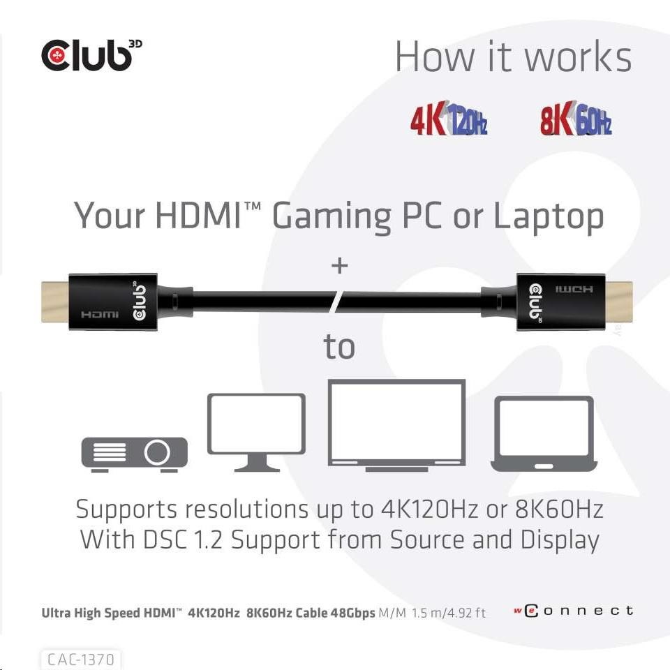 Club3D Adaptér HDMI 2.1 Ultra Rychlý HDMI™ Certifikovaný 4K120Hz, 8K60Hz, 48Gbps (M/M 1.5 m/4.92 ft), 28 AWG