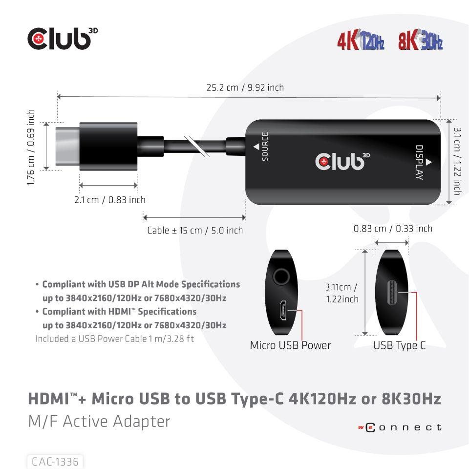 Club3D Adaptér HDMI + Micro USB na USB-C 4K120Hz/8K30Hz, Active Adapter M/FSpecifikace kabelu / redukce:Adaptér, Redukce; Input:Micro USB, HDMI; Output:USB-C.