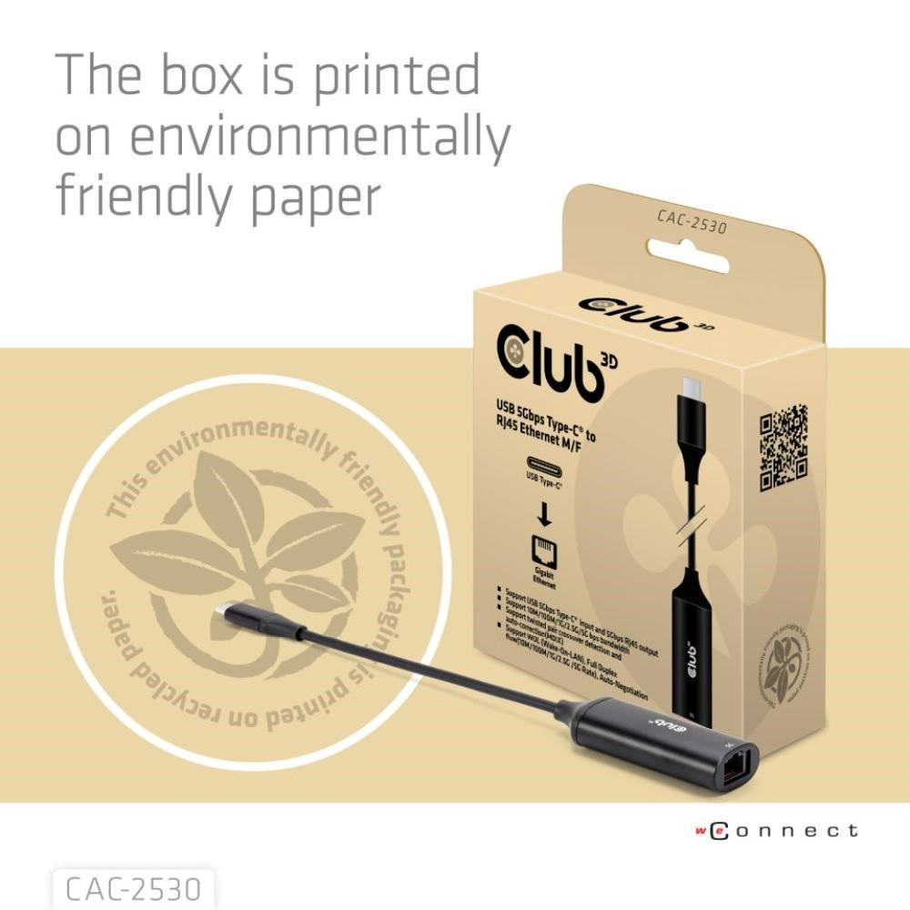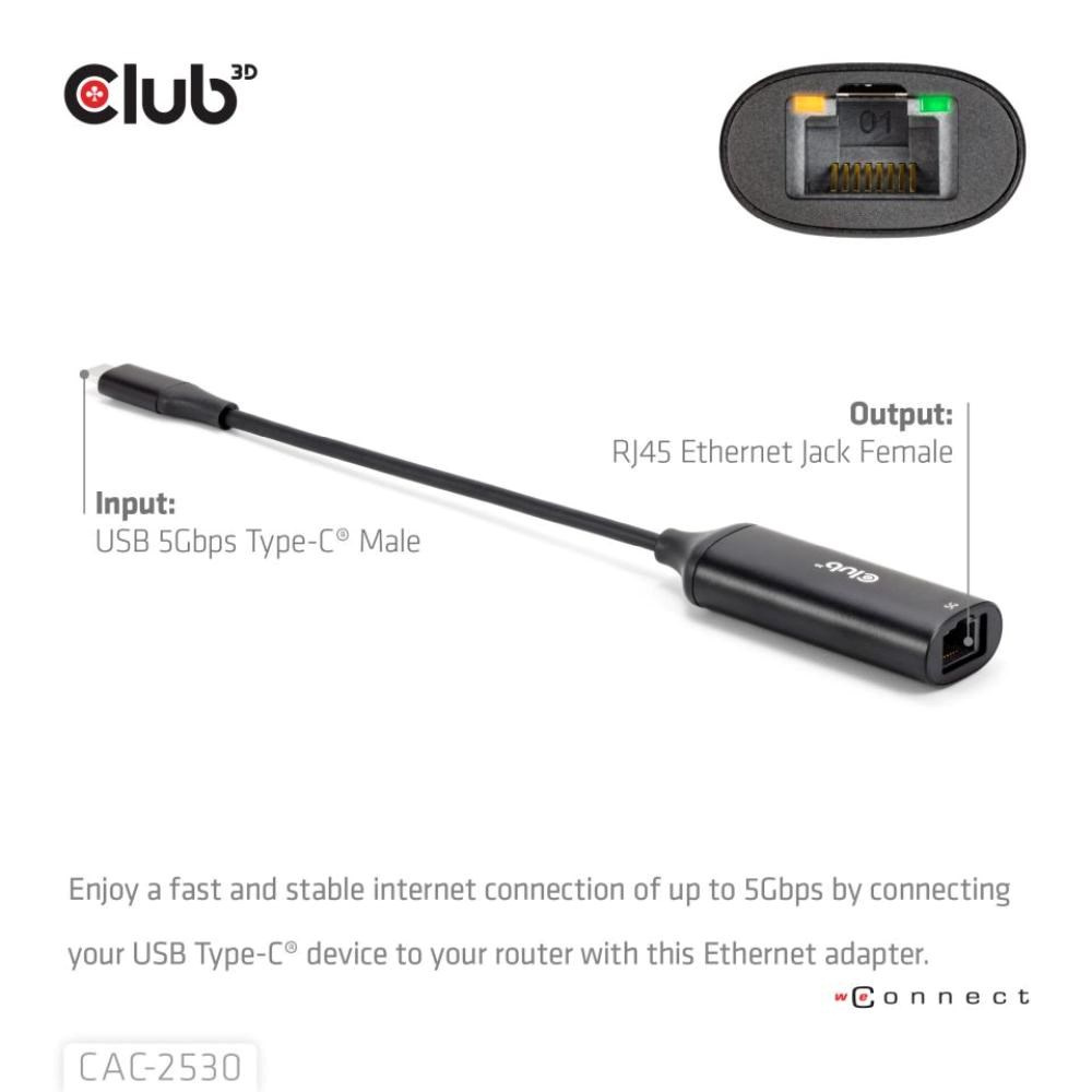 Club3D Adaptér USB-C na RJ45, 5Gb, 24cmSpecifikace kabelu / redukce:Adaptér, Redukce, Gigabit Ethernet; Verze kabelu / redukce:3.0; Input:USB-C; Output:RJ45.