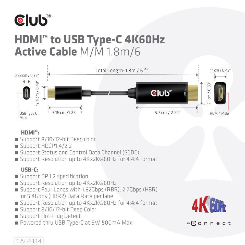 Club3D aktivní kabel HDMI na USB-C, 4K60Hz, 1.8m, M/MSpecifikace kabelu / redukce:Adaptér, Redukce; Input:HDMI; Output:USB-C.