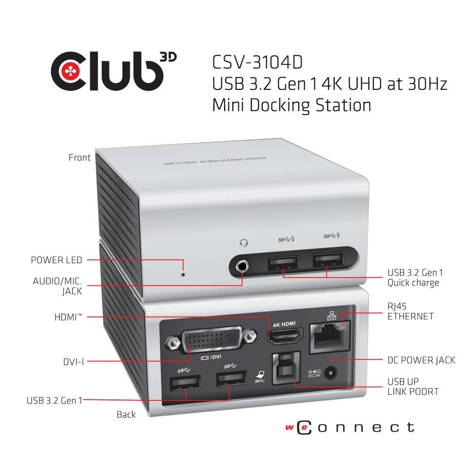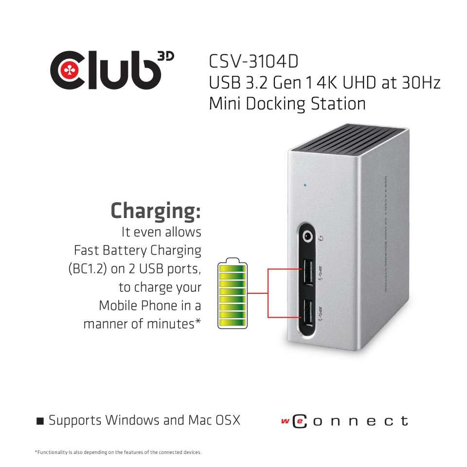 CSV-3104D The Club 3D USB 3.1 Gen 1 4K UHD Mini Docking Station design allows you to expand the outputs of your laptop or ultrabook so it can be used as a traditional desktop PC.