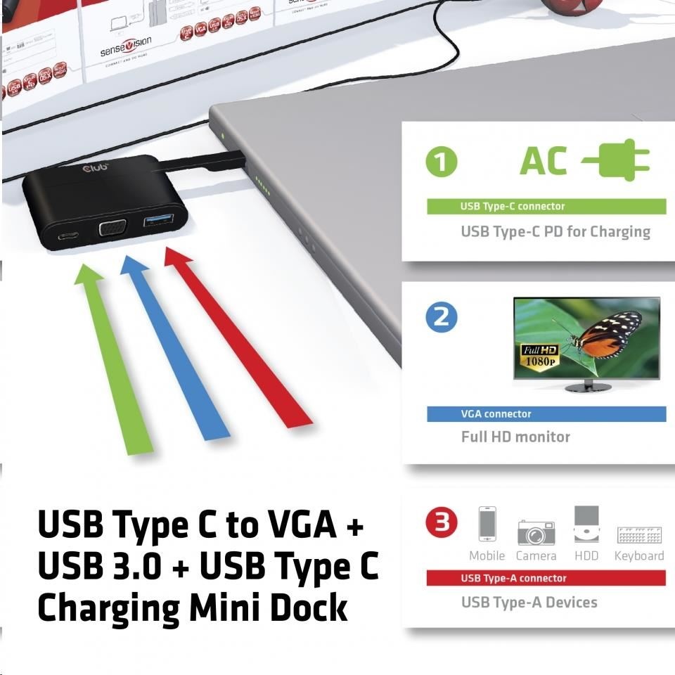 Club3D Dokovací stanice USB-C 3v1, 1xVGA, 1xUSB-C, 1xUSB, černáPočet DP portů:0; Počet HDMI portů:0; Počet VGA portů:1; Počet USB-C:1; Počet USB-A:1; Max. počet ext.monitorů:1; PD (max.W):60.