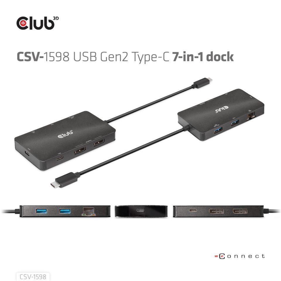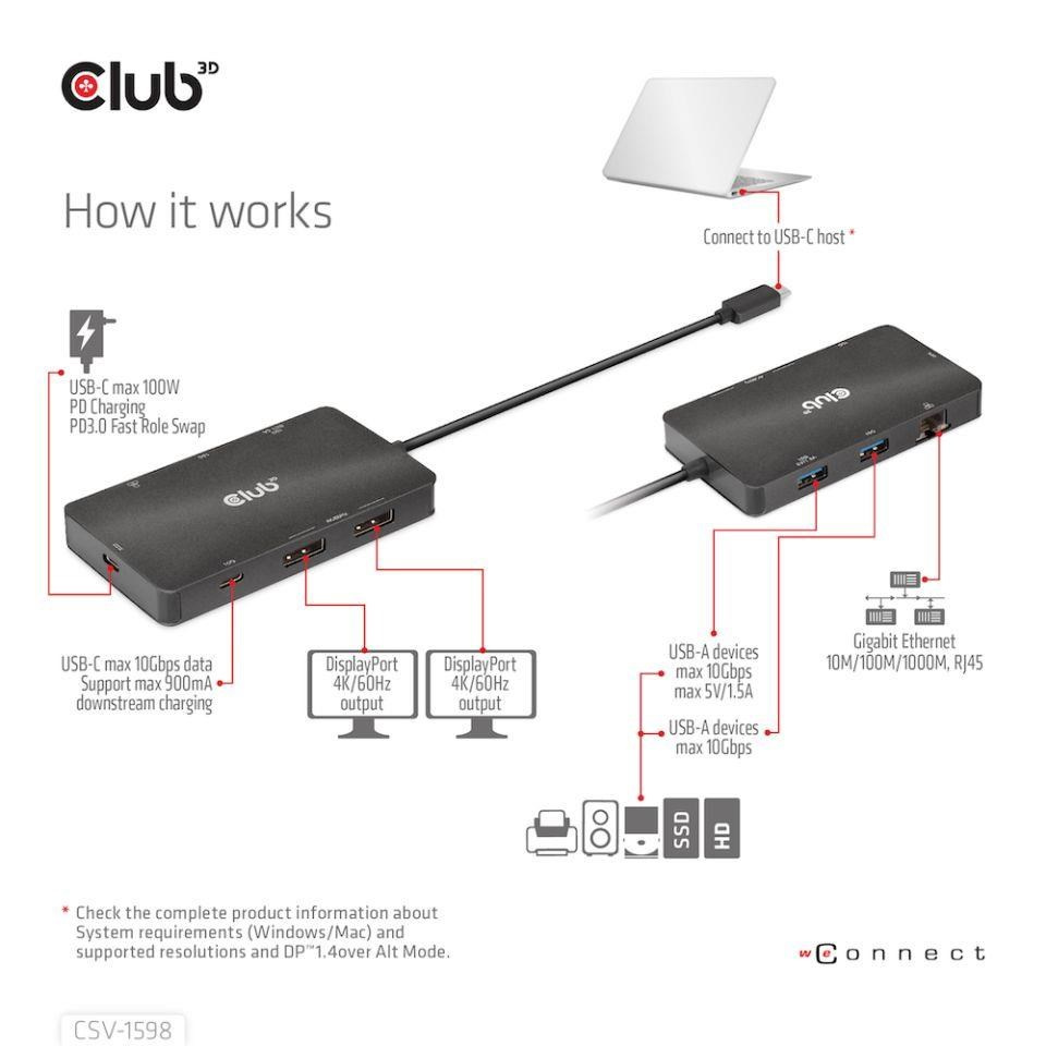 The Club 3D CSV-1598 is a 7-in-1 USB Gen2 Type-C to Dual Display Portable Dock with DP™1.4 Alt mode which provides most advanced, efficient solution to extend a single USB Type-C port to be multiple ports. It integrates video, data and power ports that allows to connect 2 DisplayPort™ 4k60Hz displays simultaneously for enjoying videos on big screen, connect multiple USB devices for data transmission , connect Ethernet source for getting PC to super high speed network. Besides, it has PD charging port which supports max 100W PD charging to support the function of the adapter and charge for the host simultaneously.It can work on all DP™ Alt mode supported USB Type-C host.