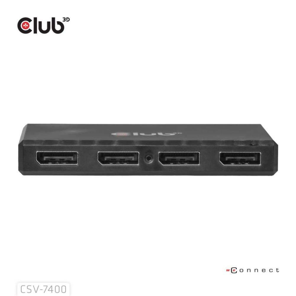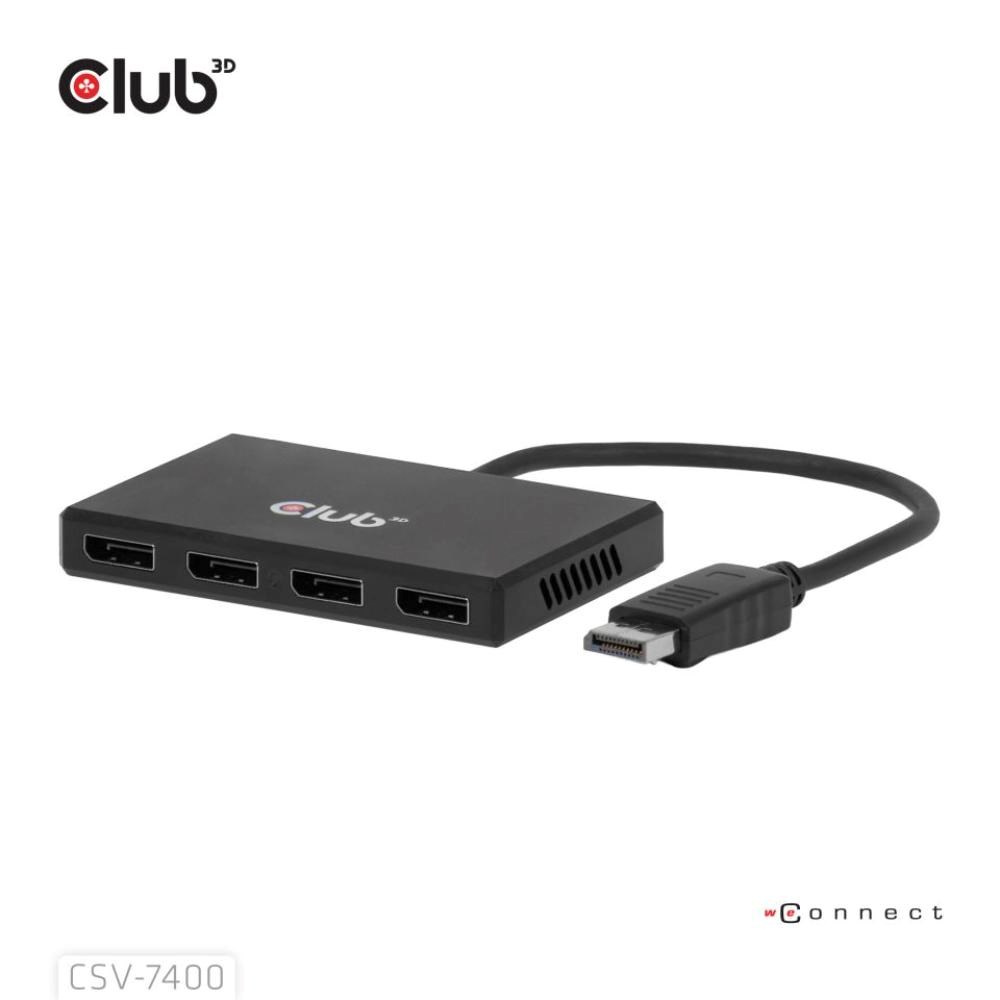 Club 3D CSV-7400 ti umožní připojit až čtyři displeje z jednoho DisplayPort zdroje. Podporuje současný výstup čtyř obrazovek v rozlišení 4K při 30 Hz, díky čemuž je ideálním řešením pro multitasking, vyšší produktivitu nebo rozšířený pracovní prostor.