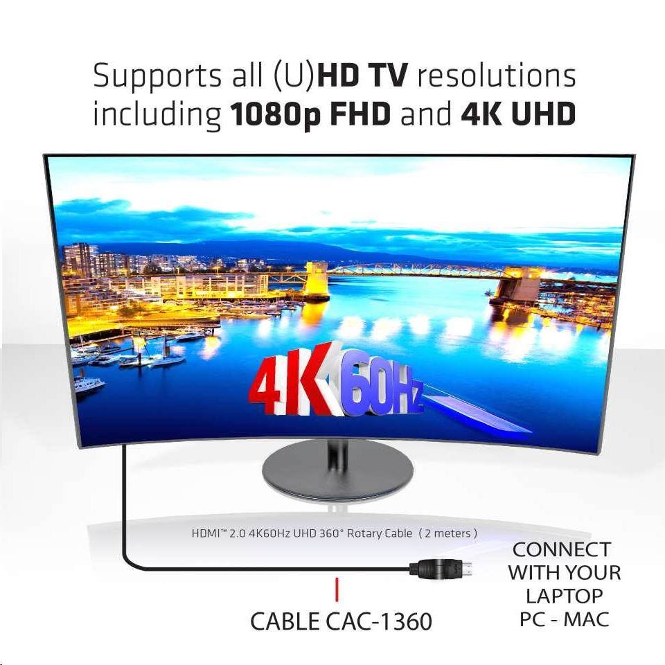Club3D Kabel HDMI 2.0 4K60Hz UHD, 360 otočné konektory (M/M), 2mSpecifikace kabelu / redukce:Adaptér, Redukce.