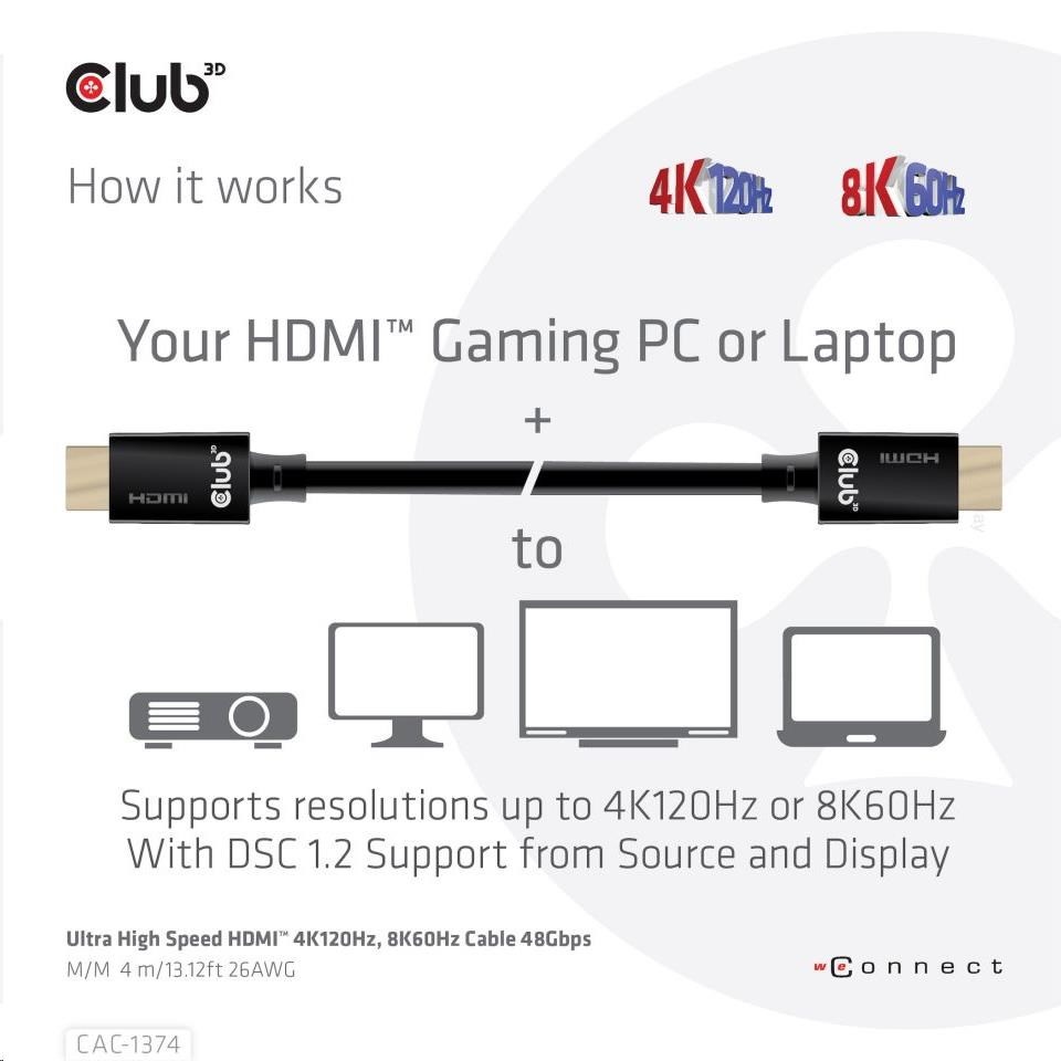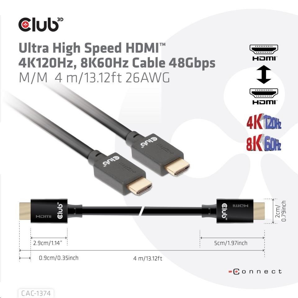 Kód: 795169Prodejní číslo: CAC-1374Club3D Kabel Ultra Rychlý HDMI™, 4K120Hz, 8K60Hz Cable 48Gbps (M/M), 28AWG, 4m