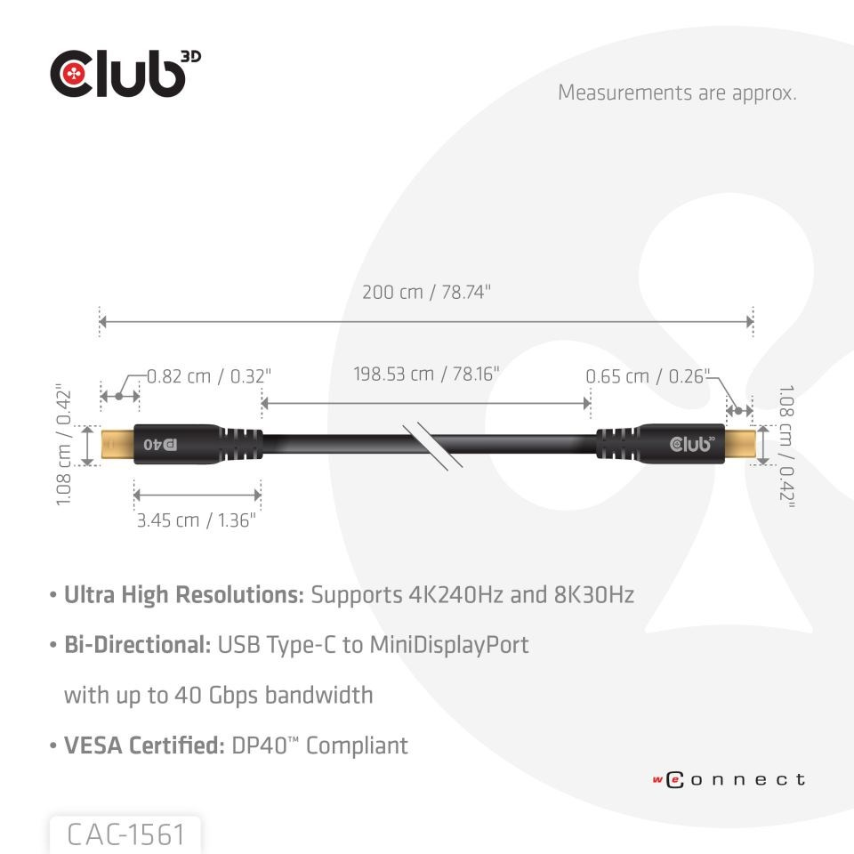 Club 3D CAC-1561 USB-C to MiniDisplayPort™ 2.1 obousměrný DP40™ koaxiální kabel, 4K240Hz, 8K30Hz 2m umožňuje připojení vašeho (herního) PC nebo notebooku k monitoru s Ultra vysokým rozlišením nebo jinému zařízení s podporou MiniDisplayPort™.