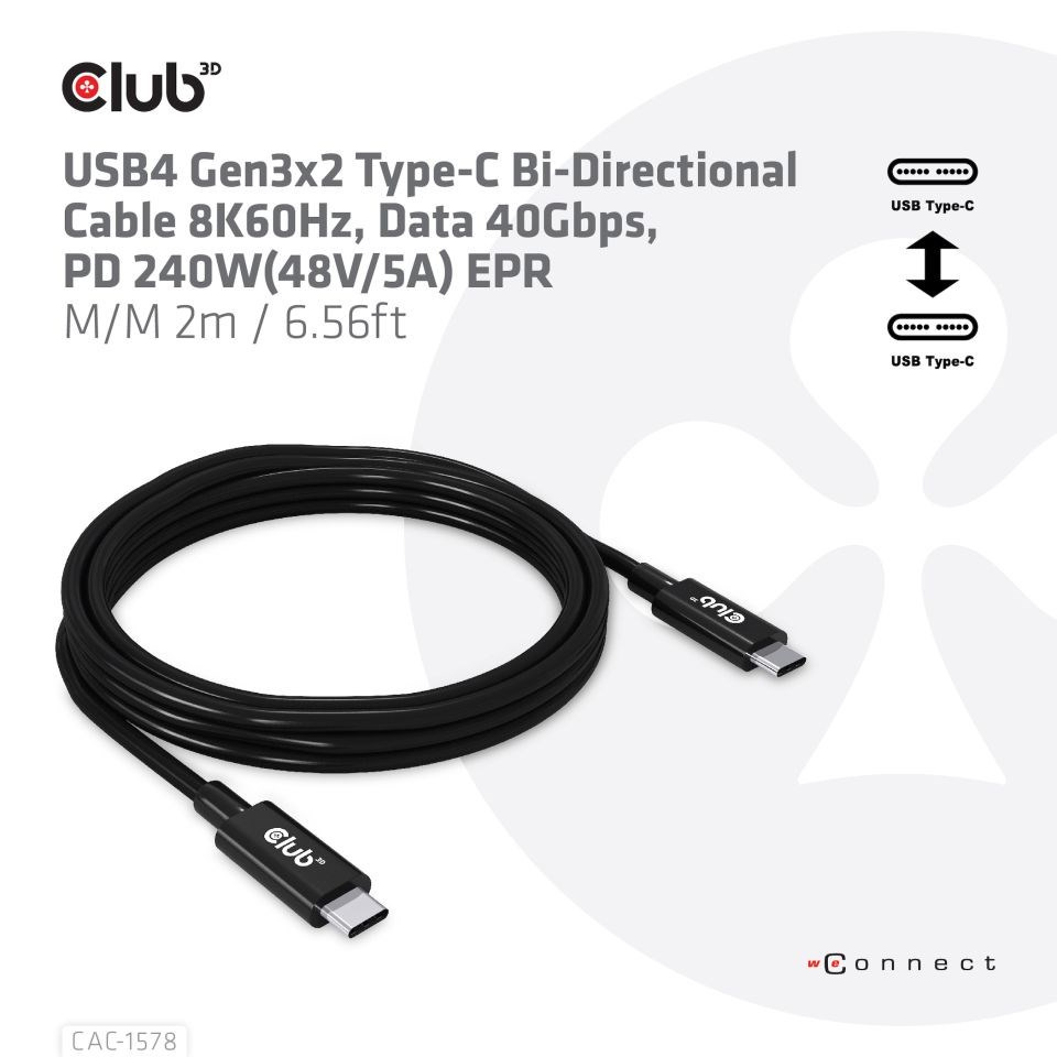 Club3D Kabel USB4 Gen3x2 Type-C Oboustranný kabel 8K60Hz, Data 40 Gbps, PD 240W(48V/5A) EPR M/M 2m