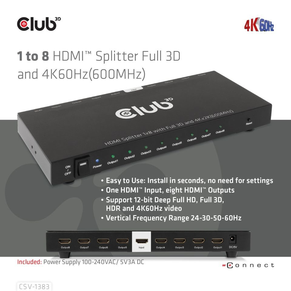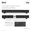 Club 3D CSV-1383 je vysoce výkonný a malý 1 až 8 HDMI™ Ultra High Definition Splitter s hot plug a železným pouzdrem. Distribuuje vstup signálu HDMI™ do osmi identických výstupů současně. Poskytuje vysoce výkonný audio a video výstup prostřednictvím kabelů HDMI™ až do rozlišení 4K@60Hz a je schopen přijímat a přenášet šířku pásma až 6Gbps/600MHz.