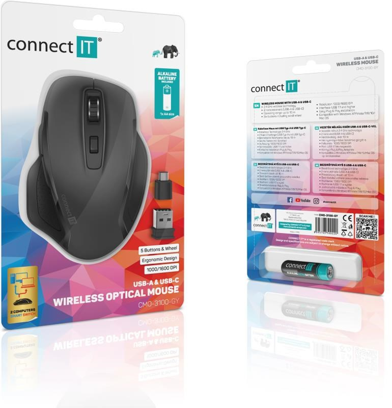 CONNECT IT Dual SmartSwitch bezdrátová myš, USB-A + C (+1x AA baterie zdarma), šedáRozhraní myši:Bezdrátová s USB dongle; Druh myši:Optická; Specifikace myši:4 a více tlačítek, S kolečkem.