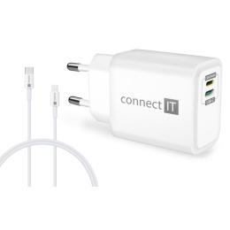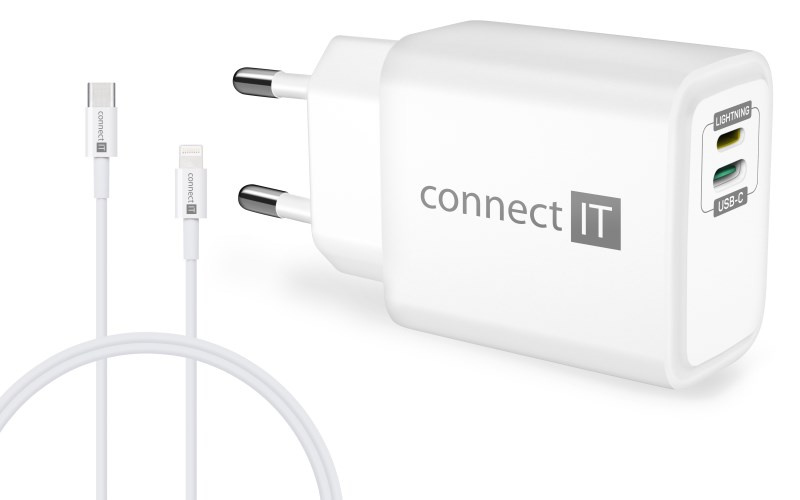 CONNECT IT Duplex nabíjecí adaptér 1xLightning, 1×USB-C, 20W, 1xLightning - USB-C kabel, bílá