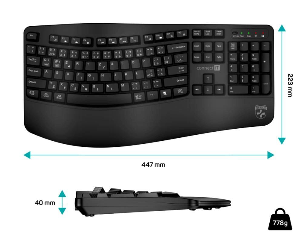 CONNECT IT FOR HEALTH Ergonomická klávesnice ErgoOffice, Bezdrátová, CZ+SK, černáTyp klávesnice:Mechanická; Rozhraní klávesnice:Bezdrátová; Lokalizace klávesnice:CZ, CZ/SK, SK; Výbava klávesnice:Multimediální klávesy.