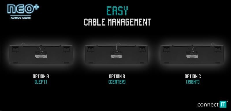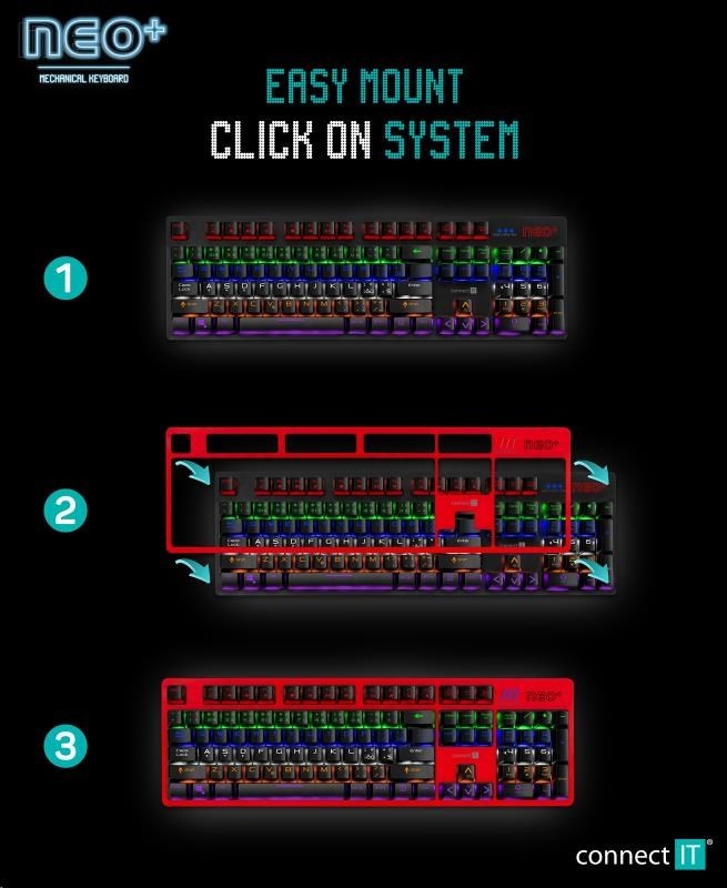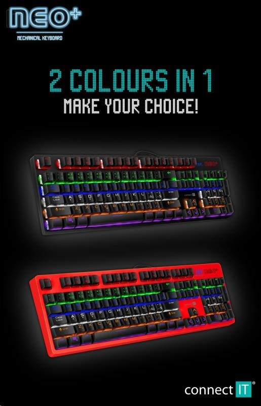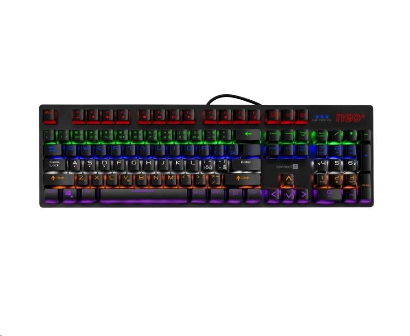 CONNECT IT Herní klávesnice NEO+, LED podsvícení, USB, CZ+SK verzeTyp klávesnice:Mechanická; Rozhraní klávesnice:Drátová USB; Lokalizace klávesnice:CZ/SK; Výbava klávesnice:Podsvícené klávesy, Makro klávesy, Multimediální klávesy.