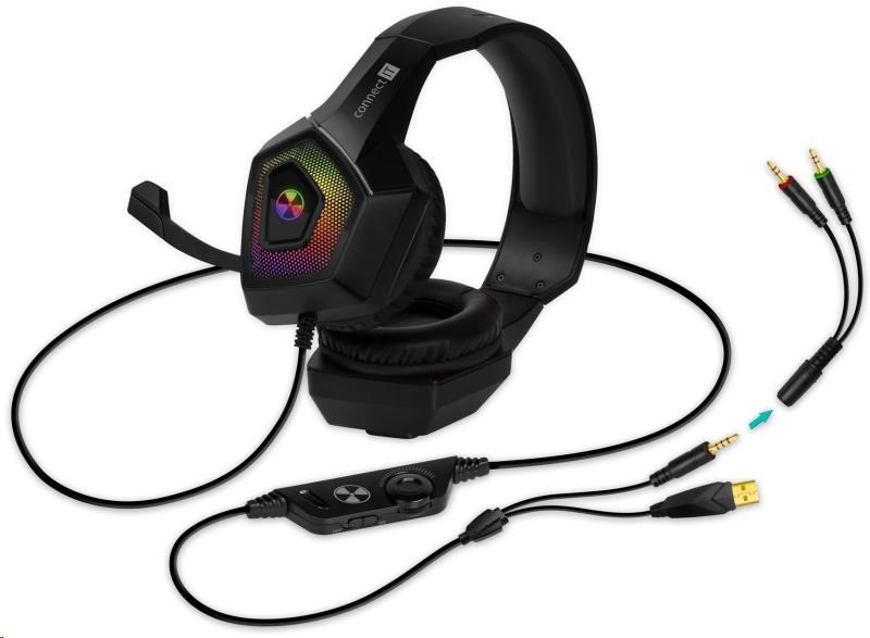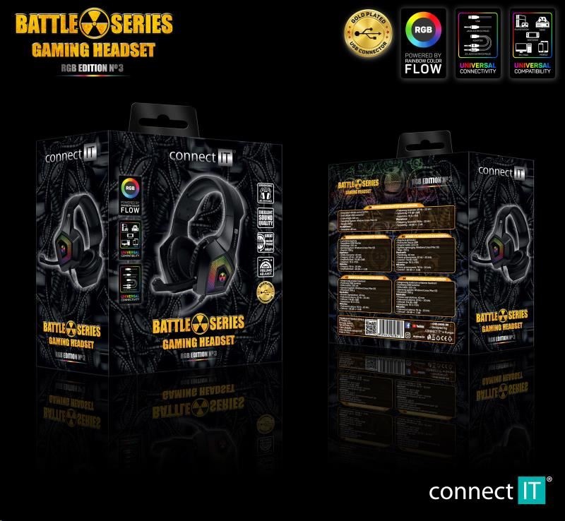 CONNECT IT herní sluchátka BATTLE RGB Ed. 3, s mikrofonem, černáTyp sluchátek:Plná; Rozhraní sluchátek:3.5 jack, USB; Vlastnosti sluchátek:S mikrofonem, Osvětlené, Ovládání hlasitosti.