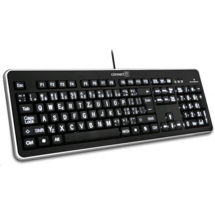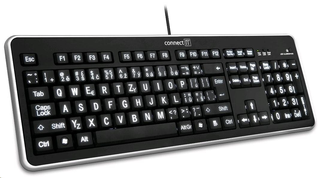 CONNECT IT Klávesnice CI-71 s LED podsvícením a VELKÝM fontem, USBTyp klávesnice:Membránová; Rozhraní klávesnice:Drátová USB; Lokalizace klávesnice:CZ; Výbava klávesnice:Podsvícené klávesy.