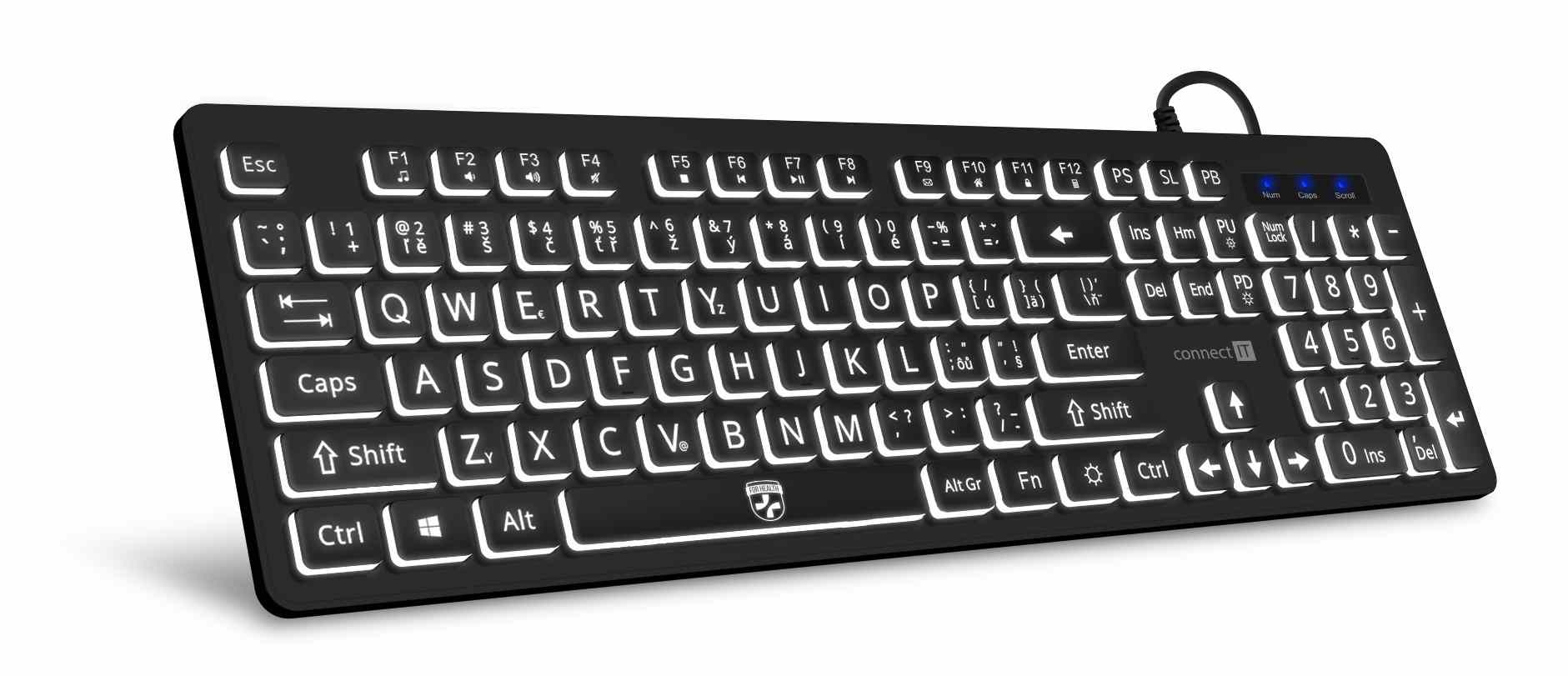 CONNECT IT Klávesnice FOR HEALTH LargeFont ergonomická klávesnice s velkým fontem, drátová, membránová, CZ + SK, černáTyp klávesnice:Membránová; Rozhraní klávesnice:Drátová USB; Lokalizace klávesnice:CZ/SK; Výbava klávesnice:Podsvícené klávesy, Multimediální klávesy.