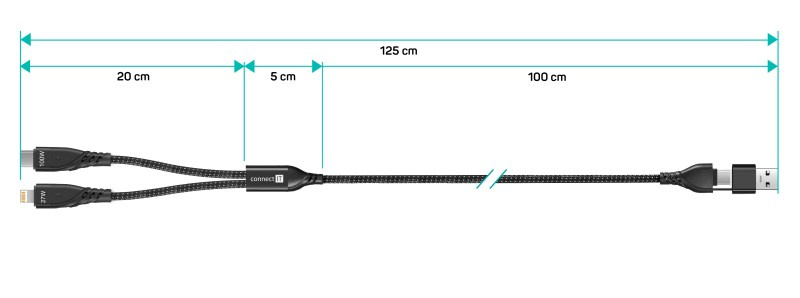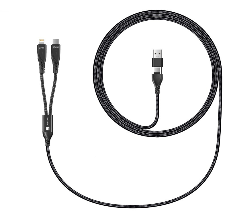CONNECT IT Nabíjecí kabel Wirez 4v1, USB-C/USB, Lightning/USB-C, 1.25m, černáSpecifikace kabelu / redukce:Lightning USB, USB-C, Napájecí; Input:USB, USB-C; Output:USB-C, Lightning USB.