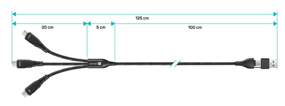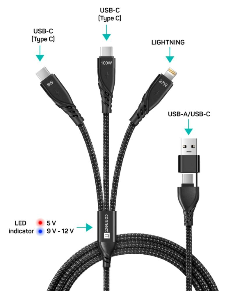 CONNECT IT Nabíjecí kabel Wirez 6v1, USB-C/USB, Lightning + 2x USB-C, 1.25m, černáSpecifikace kabelu / redukce:Lightning USB, USB-C, Napájecí; Input:USB, USB-C; Output:USB-C, Lightning USB.