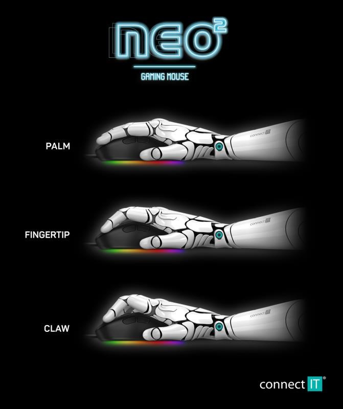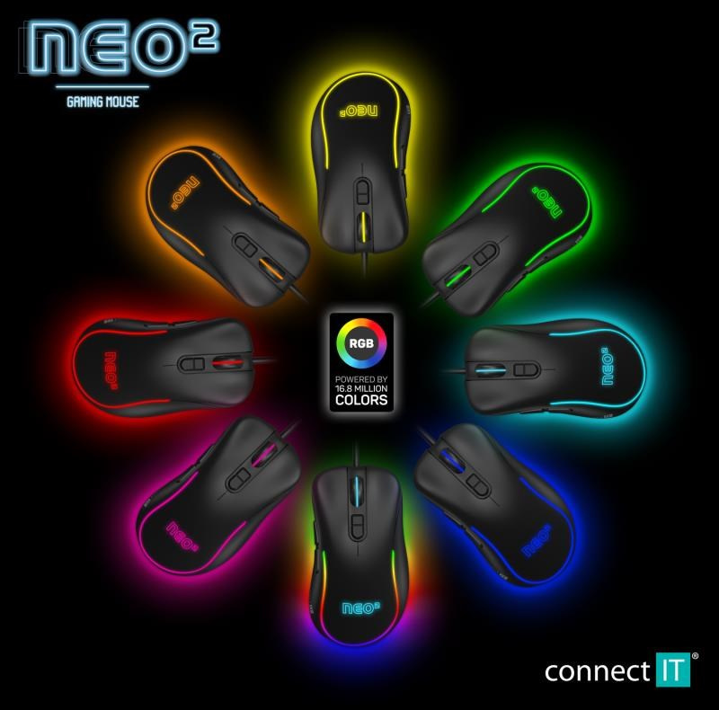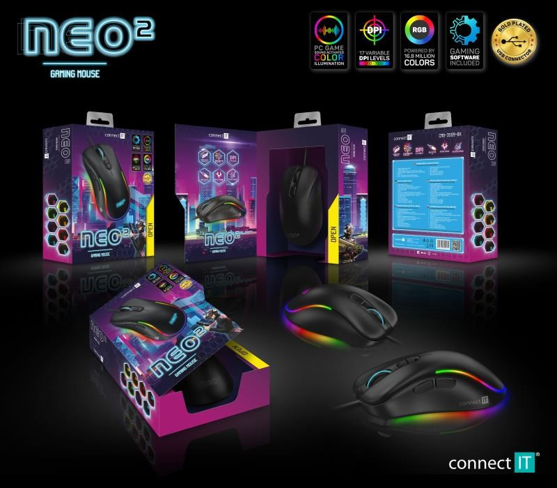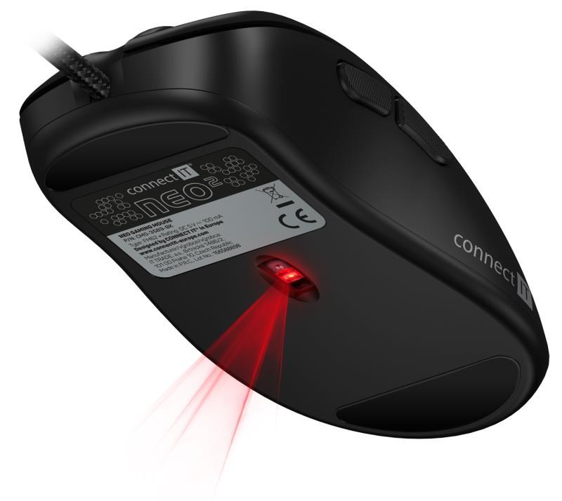 CONNECT IT NEO 2 herní myš+SW, 7200 DPI, černáRozhraní myši:Drátová USB; Druh myši:Optická; Specifikace myši:4 a více tlačítek, S kolečkem.