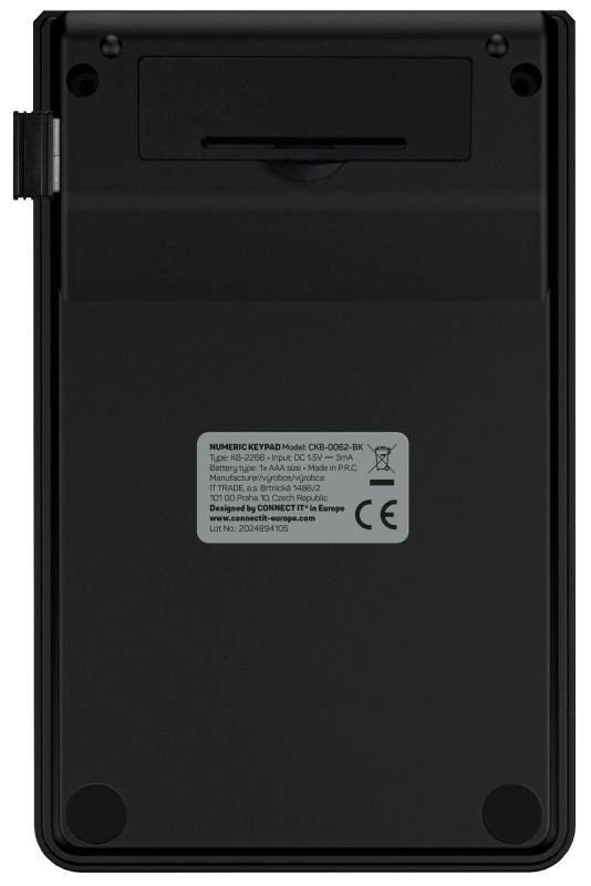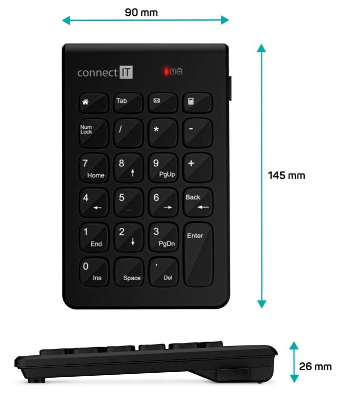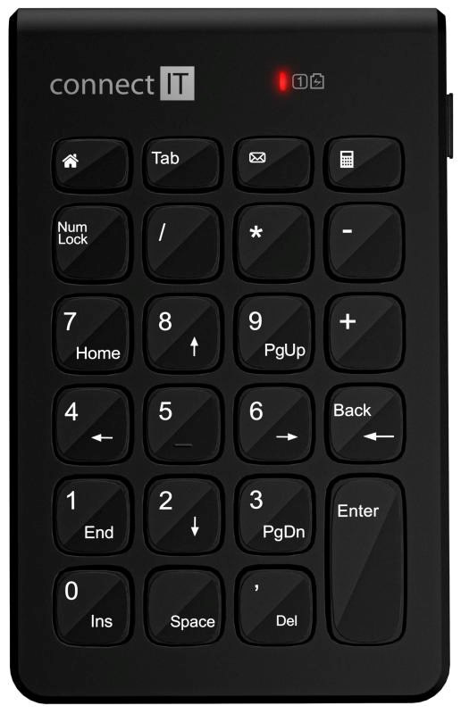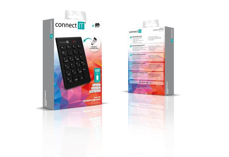 CONNECT IT NumCalc bezdrátová numerická klávesnice, 1x AAA baterie, černáTyp klávesnice:Membránová; Rozhraní klávesnice:Bezdrátová; Lokalizace klávesnice:CZ/SK.