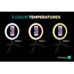 Kruhové selfie LED světlo "Selfie10Ring" s flexibilním držákem na mobilní telefon a stativem s kulovou hlavou pro domácí i profesionální použití umožňuje nastavit barevnou teplotu světla na 3 různé úrovně (3000/4500/6500 K). Součástí výbavy je dálkový ovladač na kabelu.