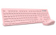Bezdrátová klávesnice a optická myš v elegantním růžovém designu, určena pro domácí i profesionální použití v kancelářích a firmách.