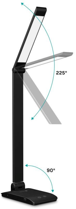 Díky sklopnému rameni a krku nastavíte dokonalý úhel pro jakoukoliv práci. Lampička disponuje USB-A výstupem s výkonem 5 W a dvěma praktickými dotykovými spínači, které umožňují zapnout/vypnout lampu, nastavit 3 úrovně jasu světla nebo nastavit barevnou teplotu světla ve 3 různých úrovních (3000/4000/6500 K).