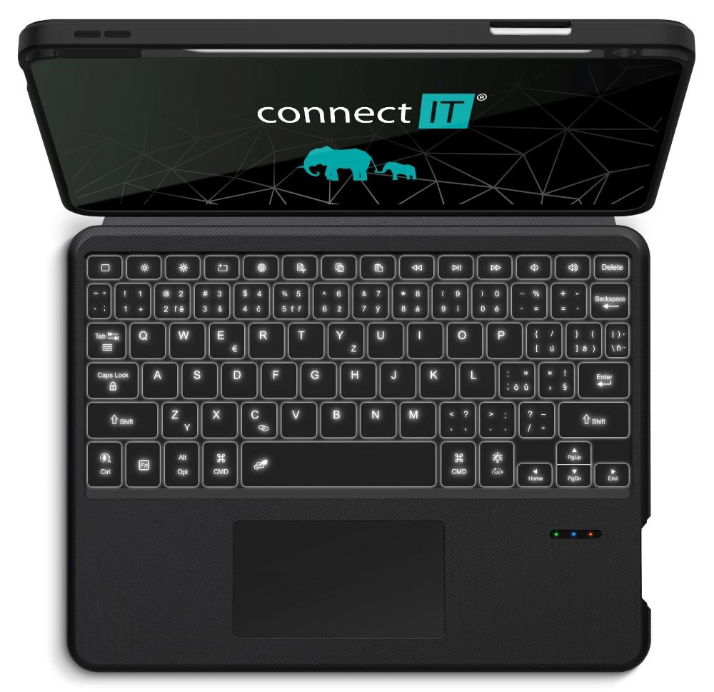 CONNECT IT TabCase podsvícená bezdrátová klávesnice s pouzdrem pro iPad 10.9", černáTyp klávesnice:Membránová; Rozhraní klávesnice:Bezdrátová; Lokalizace klávesnice:CZ/SK; Výbava klávesnice:Touchpad, Multimediální klávesy.