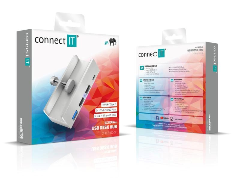 CONNECT IT USB Hub DeskHub, 1xUSB-C, 1xUSB 3.2, 2xUSB 2.0, stříbrnáDruh IO zařízení:USB hub nebo switch, USB-C hub nebo switch; Provedení:Externí.