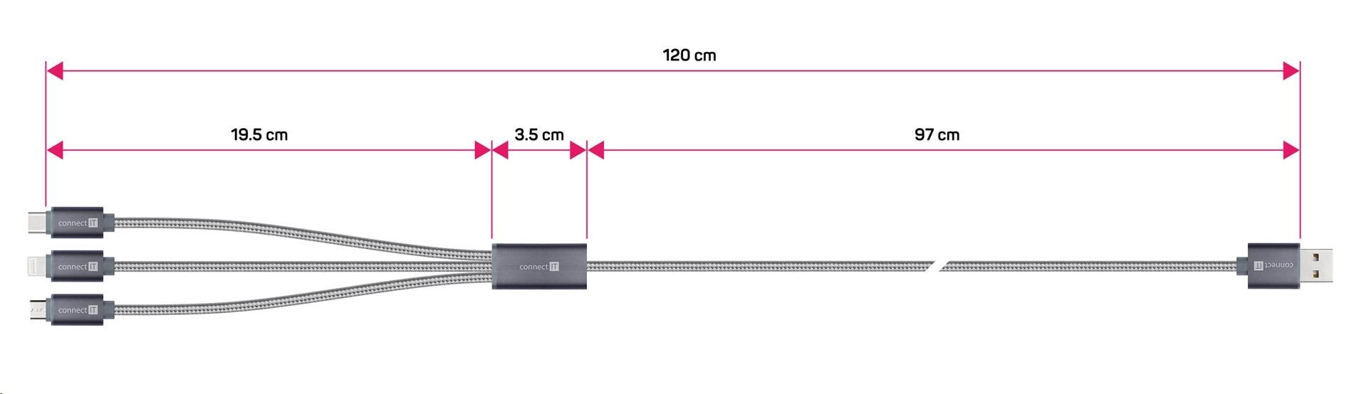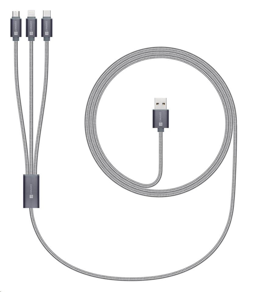 Kód: 308500Prodejní číslo: CI-1229CONNECT IT Wirez 3in1 USB-C & Micro USB & Lightning, silver gray, 1,2 m