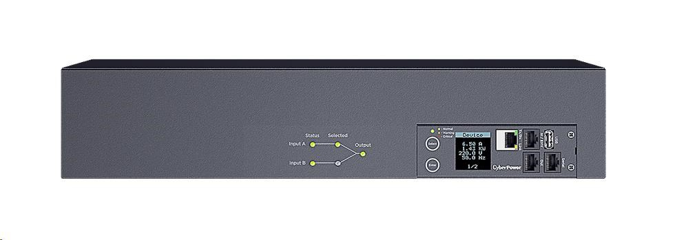 CyberPower Rack ATS Switched, 2U, 16A, (13)C13, (2)C19, IEC 60309 32A (2) 3.05mTyp zařízení:ATS; Fáze (Vstup/Výstup):1:1; Funkce:Spínané výstupy; Provedení:Rackový; Výška v Racku:2U; Vstupní proud:32A; Počet výstupů:18; Porty, Konektivita:LAN, USB, RJ45-DB9 sériový; Typ zásuvek:IEC.