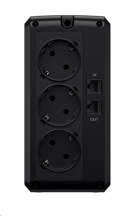 CyberPower UT Series UPS 650VA/360W, German SCHUKO zásuvkyPočet výstupních zásuvek:3; Použití:Desktop; Provedení:Tower; Zdánlivý výkon VA:650; Topologie:Line-Interactive; Fáze (Vstup/Výstup):1:1; Typ výstupu:SCHUKO; Ochrana telefonní sítě; Ochrana datové sítě.