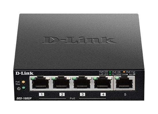 D-Link DES-1005P B1 5-Port 10/100 PoE Desktop Switch, 4x PoE+, 60W pro PoEProvedení:Desktop; Technologie:Fast Ethernet 10/100Mbps; Počet portů LAN:5; Přenosová rychlost LAN (Mb/s):100; Podporované standardy PoE:802.3af, 802.3at; Počet PoE Out portů:4; Maximální počet portů:5; Vlastnosti switche:Fuknce POE po portech.