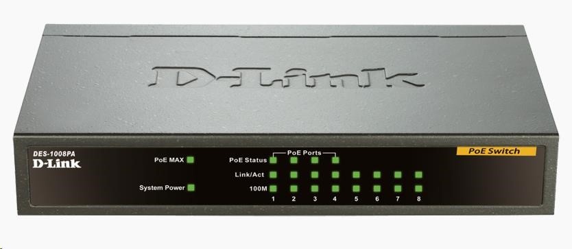 D-Link DES-1008PA 8-port 10/100 Desktop Switch with 4 PoE PortsProvedení:Desktop; Technologie:Fast Ethernet 10/100Mbps; Počet portů LAN:8; Počet portů LAN:8; Podporované standardy PoE:802.3af; Počet PoE Out portů:4; Počet PoE Out portů:4; Maximální počet portů:8; Maximální počet portů:8; Vlastnosti switche:Funkce POE po portech.