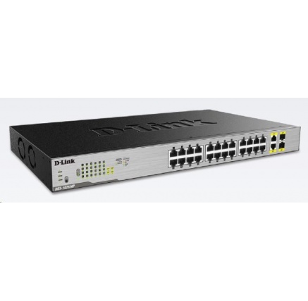 D-Link DGS-1026MP 26-Port Gigabit PoE Switch, 24x gigabit PoE RJ45, 2x gigabit RJ45/SFP, PoE budget 370WProvedení:Rack mounted 19"; Technologie:Gigabit Ethernet 1000Mbps; Počet portů LAN:24; Počet portů LAN:24; Přenosová rychlost LAN (Mb/s):1000; Přenosová rychlost LAN (Mb/s):1000; Podporované standardy PoE:802.3af, 802.3at; Počet PoE Out portů:24; Počet PoE Out portů:24; Počet portů Combo:2; Počet portů Combo:2; Ventilátor; Maximální počet portů:24.