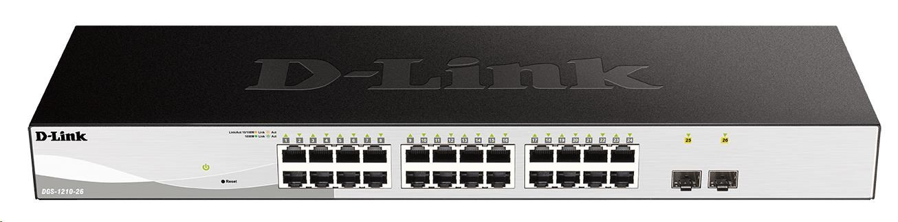 D-Link DGS-1210-26 26-port Gigabit Smart+ Switch, 24x GbE, 2x SFP, fanlessProvedení:Rack mounted 19"; Technologie:Gigabit Ethernet 1000Mbps; Maximální počet portů:24; Maximální počet portů:24, 26; Management:Web; Vlastnosti switche:Rozšiřitelnost.