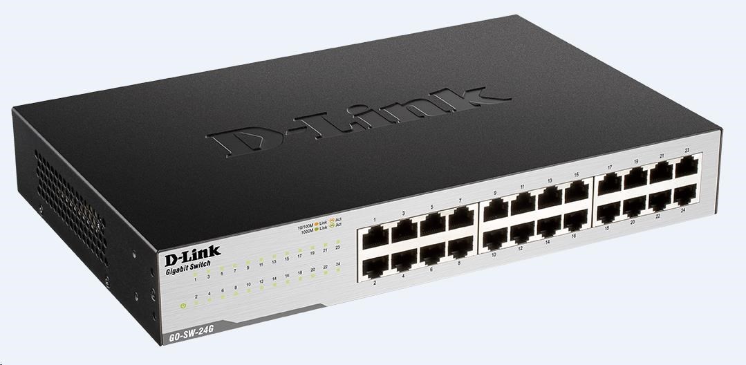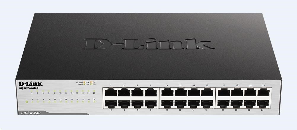 D-Link GO-SW-24G 24-Port GIGABIT EASY DESKTOP SWITCHProvedení:Desktop, Rack mounted 19"; Technologie:Gigabit Ethernet 1000Mbps; Počet portů LAN:24; Přenosová rychlost LAN (Mb/s):1000; Maximální počet portů:24.
