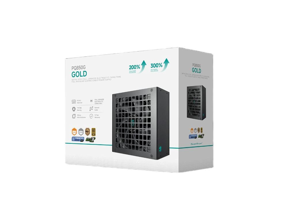 DEEPCOOL GAMERSTORM zdroj 850W PQ850G, 120mm, Plně modulární, 80+ Gold, ATX 3.1, černáVýkon zdroje (W):850; Formát zdroje:ATX; Konektory:8pin CPU 1x, PCIe 8-pin, PCIe 16-pin Gen5, SATA 15-pin, Molex; Konektory pro základní desku:ATX 24-pin; Modulární kabeláž; Efektivita zdroje:80 Plus Gold; Vlastnosti zdroje:Modulární kabeláž; Podsvícení:Bez podsvícení.