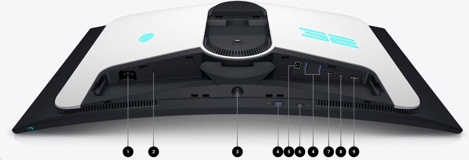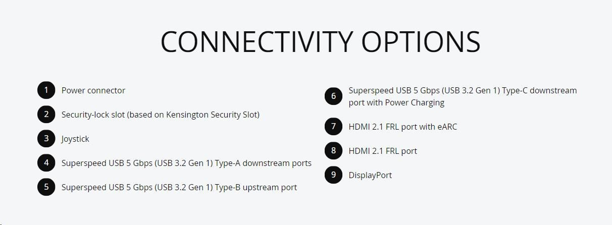 - Plejáda možností připojení přes 2× HDMI 2.1 FRL, 1× DisplayPort 1.4, USB-C a USB 3.2