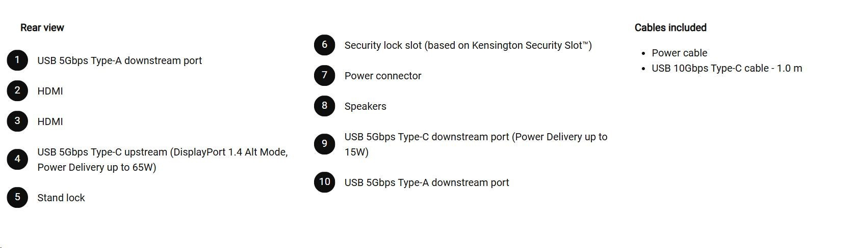 - 1 × USB-C 5Gbps upstream port (DisplayPort 1.4 Alternate Mode, Power Delivery až 65 W) – podpora až 3440 × 1440, 120 Hz, HDR, AdaptiveSync