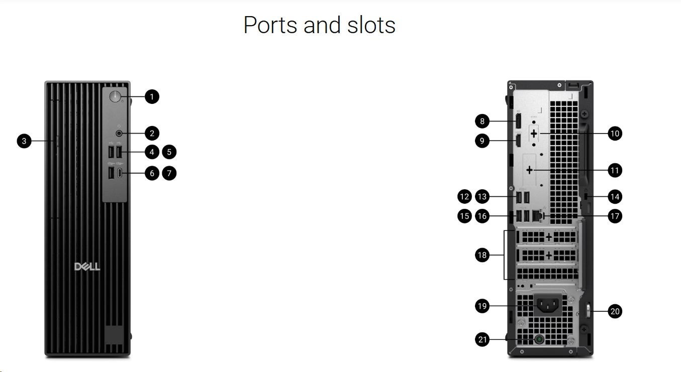 K propojení s dalšími zařízeními slouží u počítače Dell dostatečná konektorová výbava. Ta zahrnuje nepostradatelné rozhraní USB 2.0 u 4 konektorů a USB 3.2 Gen1 (USB 3.0), které zde najdete 3×. Široké využití si najde i USB-C. Celou škálu zvukových zařízení můžete připojit kombinovaným Jack konektorem. K připojení monitoru je u počítače Dell Pro Slim QCS1250 přichystáno HDMI a DisplayPort. U tohoto modelu počítejte s optickou mechanikou, která zajistí přečtení dat z disků. Počítač pracuje s operačním systémem Windows 11 Pro.