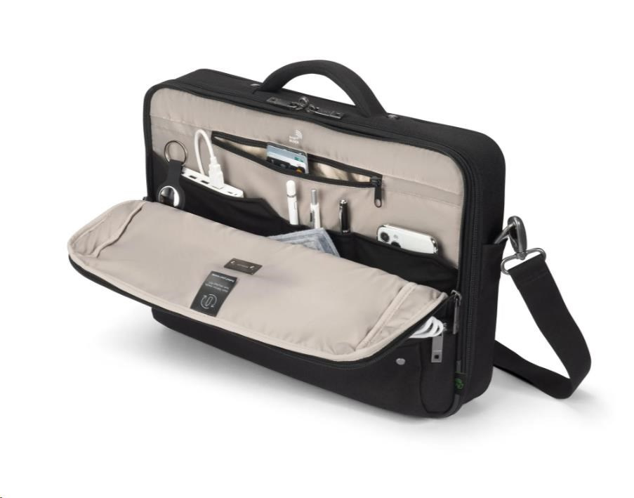 MULTI FIVE zajišťuje optimální ochranu a organizaci vašich zařízení a dokumentů. Uzamykatelná přihrádka na notebook s pěnou HDF poskytuje maximální bezpečnost, zatímco integrovaná kapsa na tablet nabízí další úložný prostor. Ve vyhrazené zadní přihrádce jsou dokumenty přehledně uspořádány a přední část obsahuje strukturované kapsy na příslušenství. Brašna je vyrobena z 19,5 recyklovaných PET lahví a je tak chytrou volbou, která je šetrná k životnímu prostředí.