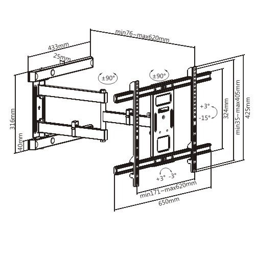Držák LCD LED Tv Fiber Mounts TALL1Kvalitní nástěnný držák pro zavěšení Tv 37-80", otočný +/-90°, sklopný +3°/ -15°, korekce roviny, délka 76-620mm, VESA 200x100 až 600x400, nosnost 50kg.