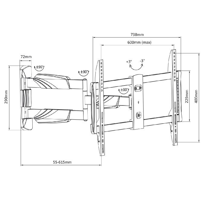 Držák LED LCD Tv Fiber Mounts M8C33Nástěnný držák pro zavěšení televize 37-70", otočný +/-90°, sklopný +10°/-15°, vzdálenost Tv od zdi 55-615mm, korekce roviny +/-3°, krytky na kabely, VESA 200x100 až 600x400, nosnost 35kg.