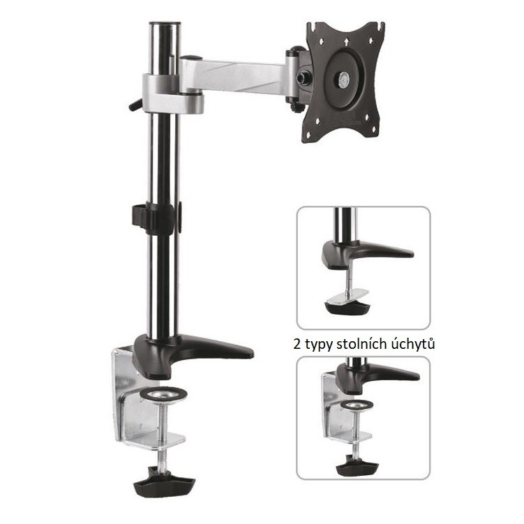 Držák monitoru na stůl Fiber Mounts M7C17 Stolní držák na monitor 13"-32", otočný +/- 180°, sklopný +/- 35°, výškové nastavení 100-380mm, funkce pivot +/- 360°, vzdálenost od nosníku 0-204mm, instalační materiál, 2 úchyty, VESA standard 75x75 a 100x100, nosnost 8kg Velmi pěkný, kvalitní a cenově dostupný stolní držák pro zavěšení všech typů a značek monitorů s úhlopříčkou 13" až 32". Plná nastavitelnost polohy obrazovky - otáčení do stran +/- 180°, naklápění +/- 35°, výšková regulace 100-380mm, funkce pivot = horizontální nebo vertikální otočení obrazovky +/- 360°, vzdálenost od stolního uchycení 0-204mm. Stolní držák podporuje VESA standardy 75x75 a 100x100, doporučené maximální zatížení je 8kg. Součástí balení je montážní materiál a 2 typy uchycení na stolové desky o síle 10-85mm - na krajní hranu stolu nebo skrz stolovou desku kdekoliv do prostoru. Držák je výborné kvality a pěkného designu. Záruka 5 let. Stolní držák monitoru do kanceláře nebo pracovny Fiber Mounts M7C17 Technické údaje: nosnost 8kg podpora VESA standardů 75x75 a 100x100 doporučujeme na monitory s úhlopříčkou 13" až 32" otáčení do stran +/-180° naklápění +/- 35° nastavitelná výška 100-380mm horizontální nebo vertikální otočení obrazovky = funkce pivot +/- 360° vzdálenost monitoru od nosníku 0-204mm 2 typy stolních úchytů (na okraj a do prostoru) na stolové desky o síle 10-85mm průměr nosníku 35mm, výška nosníku od stolové desky 400mm vynikající kvalita, profesionální zpracování snadné nastavení pozice obrazovky monitoru materiál hliník + ocel barva stříbrná + chrom záruka 5 let Kancelářský držák na monitor v profesionální kvalitě a krásném provedení Fiber Mounts M7C17 Ideální stolní držák do domácností, kanceláří, škol a podniků. Díky velmi pěknému designu, výborné kvalitě, snadné nastavitelnosti a dostupné ceně patří tento držák Fiber Mounts M7C17 mezi velmi oblíbené..