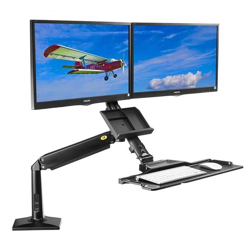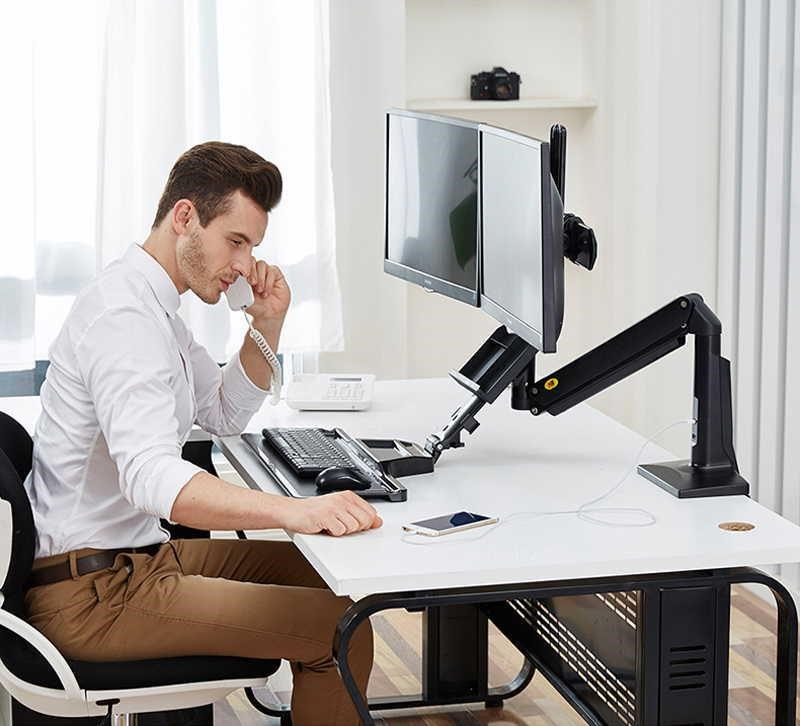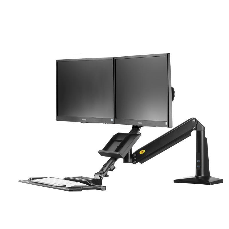 Držák na 2 monitory a klávesnici NB FC24-2A-BStolní držák pro dva monitory 17-27" s policí na klávesnici, ergonomický pro práci vsedě nebo vestoje, kompletní polohovatelnost, VESA 75x75 a 100x100, nosnost 15kg.