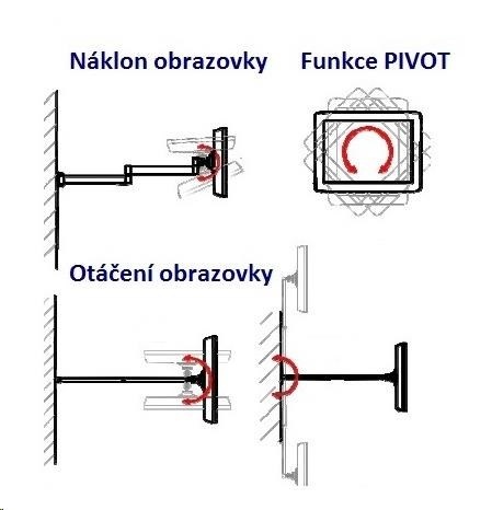 Držák Tv monitoru Edbak GD18 Otočný, sklopný držák na Tv nebo monitor, PIVOT, nejdelší ramena na trhu, černý nebo stříbrný Velmi kvalitní držák, který je vhodný pro zavěšení monitorů a menších televizorů na zeď, ale i sloupek nebo trám. Držák má unikátní konstrukci - velmi dlouhé ramena, díky kterým je manipulace s obrazovkou velmi snadná a bez omezení. Doporučujeme použití na místech, kde je potřeba poměrně velká manipulace s monitorem nebo v případě, že potřebujete velké vychýlení obrazovky od místa ukotvení držáku. Výborná kvalita. Doporučujeme. Polohovatelný držák na Tv nebo monitor 15-30 palců, otočný, sklopný, délkově nastavitelný - EDBAK GD18 / drzakyastolky.cz Popis výrobku: nosnost 10 kg na monitory a Tv s úhlopříčkou 15" až 30" podporuje VESA standard 75x75 a 100x100 možnost rozšíření VESA standartu na 200x100 nebo 200x200 (za příplatek) otáčení do stran +/- 90° náklon +10° až -80° funkce pivot - horizontální i vertikální otočení obrazovky minimální vzdálenost od zdi 120mm maximální vzdálenost od zdi 792mm - nejdelší držák na monitory na trhu!!! vynikající kvalita ocelová konstrukce barva černá, stříbrná nebo bílá záruka 5 let Držák podporuje VESA standardy: VESA 75x75 VESA 100x100.