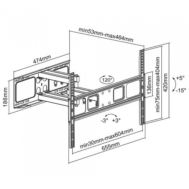 Dvouramenný výsuvný držák Tv Fiber Mounts M7C1Kvalitní dvojramenný držák na televize 37-70", otočný +/-60°, sklopný +5°/-15°, vzdálenost Tv 53-464mm, korekce roviny +/-3°, instalační materiál, VESA 75x75 až 600x400, nosnost 40kg.